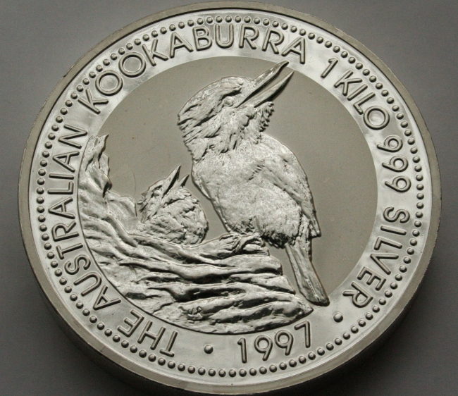 Fine Silver Australian Kookaburra Fine Silver 0.999 and 1 kilogramme in weight 10cm in diameter and dated 1997